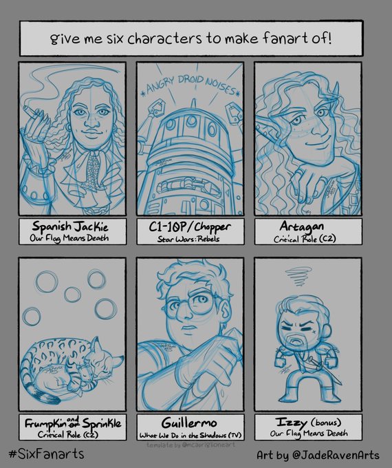 Six Fanarts, part two of two. Thank you again for your suggestions!! I had fun with these! The bonus Izzy is because two people requested him lol #OurFlagMeansDeath #StarWarsRebels #CriticalRoleFanArt #ShadowsFX