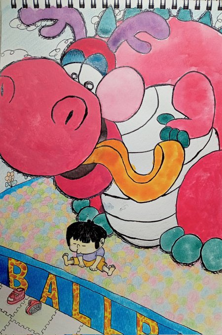 ボールプールのかいじゅう #アクリル画 #色鉛筆 #水彩画 #絵描きさんと繫がりたい #絵柄が好みって人にフォローされたい #アナログ絵 #創作イラスト