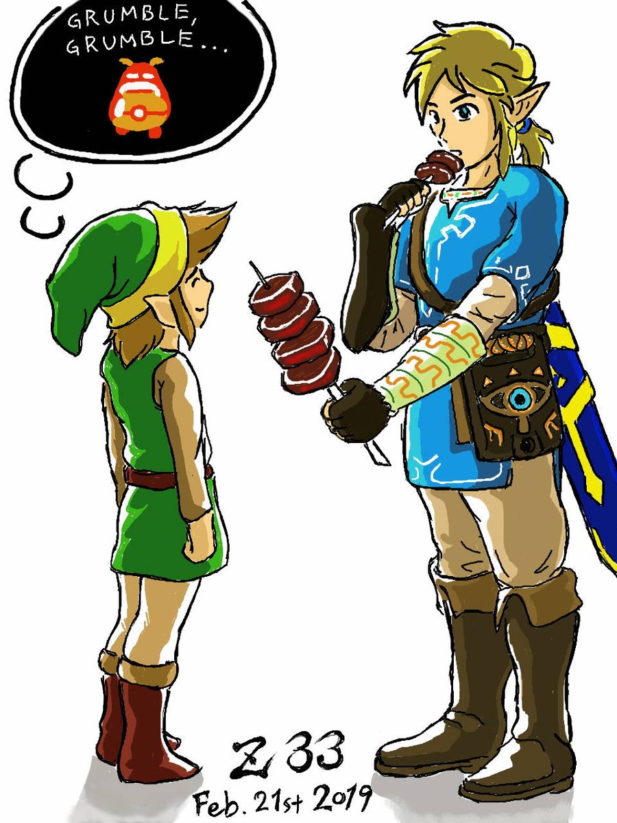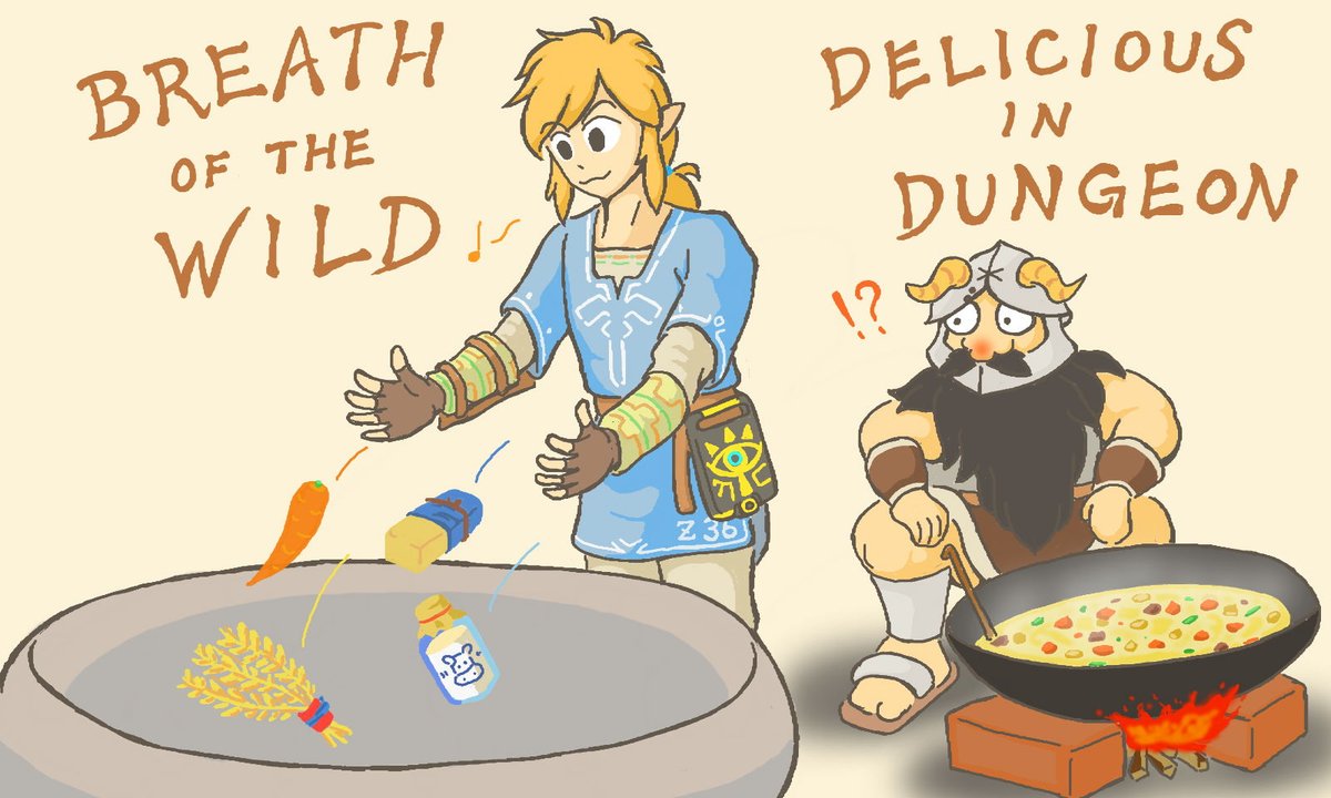 今日は「ゼルダの伝説 ブレスオブザワイルド」5周年の日ですね。 なので記念絵ではないのですが、好きなマンガである「ダンジョン飯」とのコラボイラストを描いてみました。 #ブレスオブザワイルド5周年