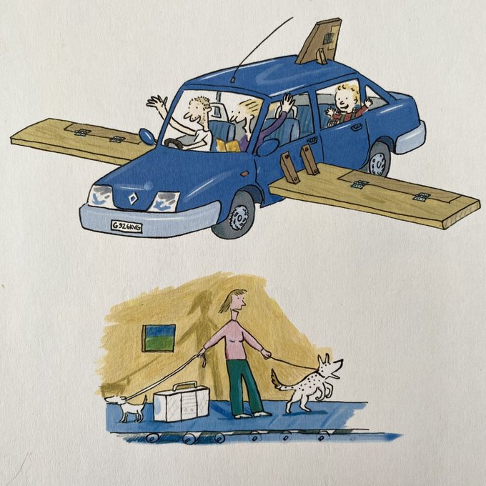 From the archives: top image - no idea what for but that was our car at the time. I obv had plans to make it fly. I’m pretty sure the bottom image was for @Battersea_ #illustration #dog #flyingcar #renault