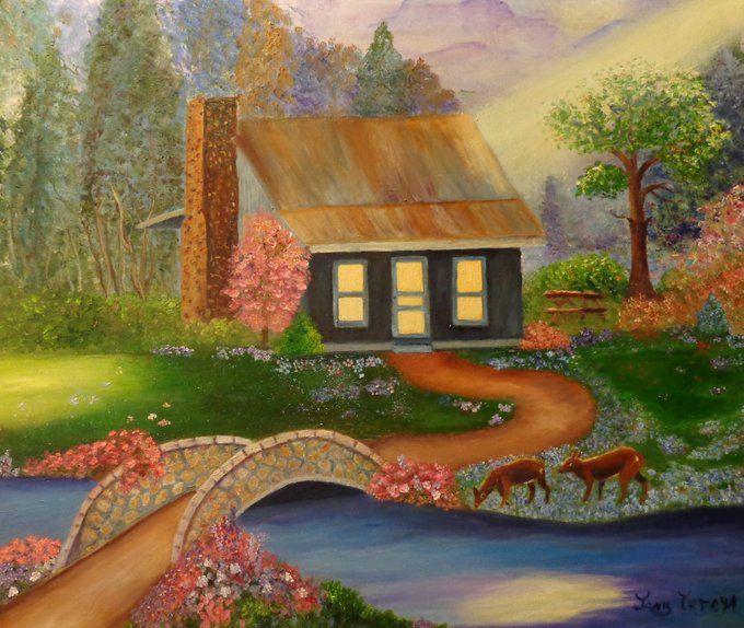 janistafoya.com #ArtbyJanisTafoya #landscape #Mountains #Trees #Forest #Lake #Mist #Cabin #FreeShipUSA