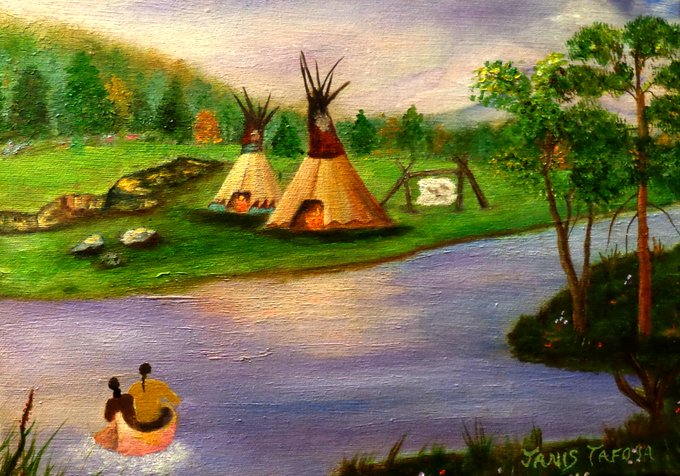 janistafoya.com #ArtbyJanisTafoya #teepee #canoe #river #trees #sheepskin #Starburst #oval #Beecatcher