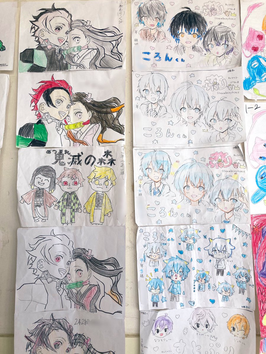 すとぷり、ティーンに人気!とか、中高生から絶大な支持!みたいな印象だったけど、小学生にもこんなに大人気なん!? なんなら廊下に掲示されてるイラスト鬼滅の刃とかポケモンより多いんやが??? #すとぷり #すとぷりギャラリー
