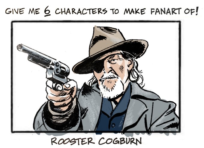 1 of 6 Still taking suggestions First up Rooster Cogburn. Thanks to @IamJBStevens for the inspiring suggestion. Used a horizontal format, cause I'm a rebel. Looks like a storyboard panel now. #sixfanarts #TrueGrit #Western #RoosterCogburn #JeffBridges #film #drawing #Cowboys