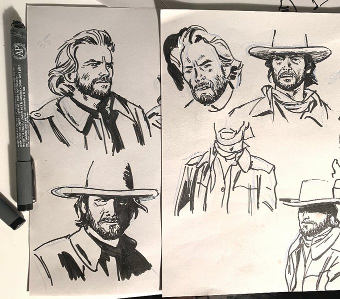 A couple of preliminary studies of Clint from The Outlaw Josey Wales for the 3rd #sixfanarts drawing. Challenging to get a likeness and still keep it loose and cartoony...at least for me
