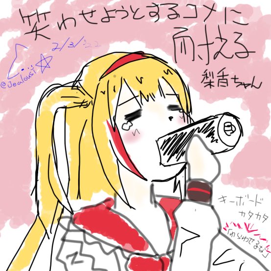 7 38 #とじょりんアート 「梨香ちゃんがんばえー!」 チャット欄に応援されながら黙ってもぐもぐした無言配信回 梨香ちゃんは黙って喋るスキルを覚えた、かもしれない 線の雑描きで放置してたけど続き描かない気がしたので、雑に色足してそのままここに…えいっと! 来年はハーフサイズだね! 22/02/08 00:30