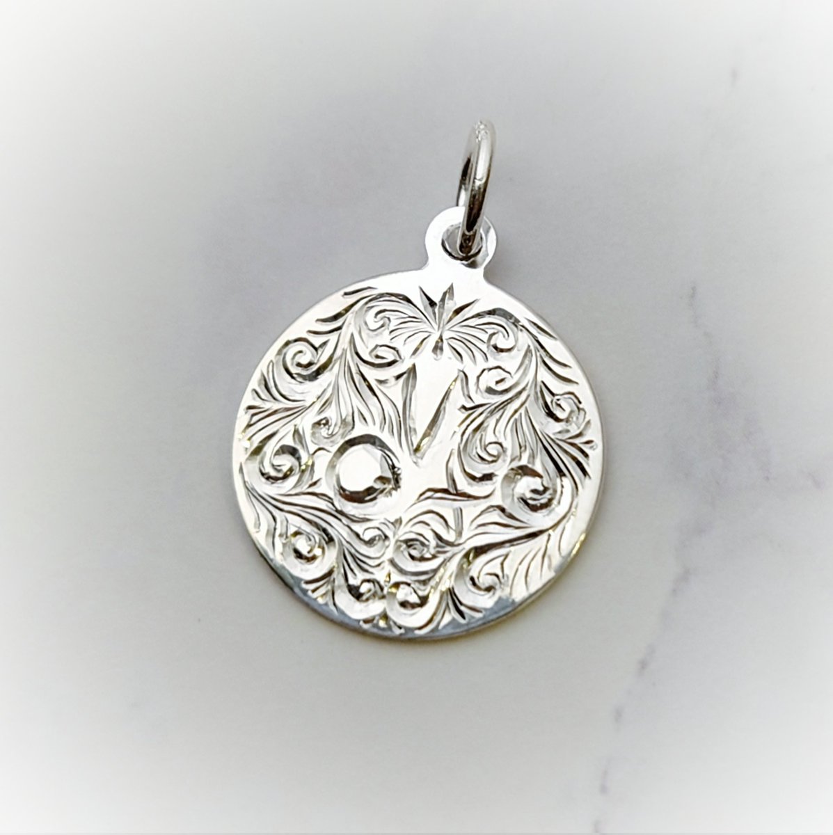 Draw "SHU" with Arabesque on silver pendant by handcrafted engraving #shuYamino #YaminoArt #tyoukin_acg #彫金