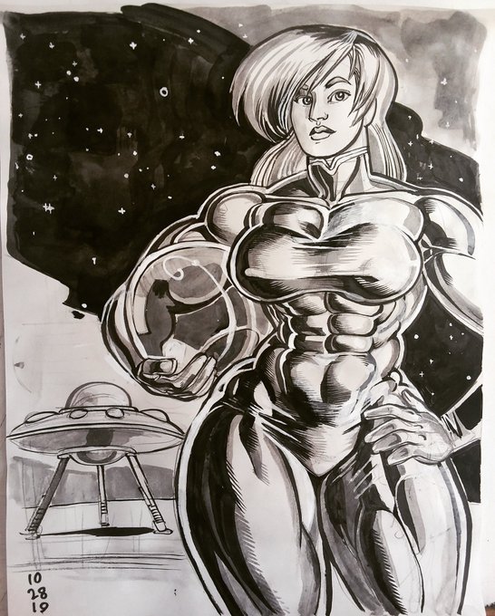 Inktober day 28. Retro astronaut- which means skintight silver spacesuits, obviously. #artwork #inktober #musclewoman #retroscifi