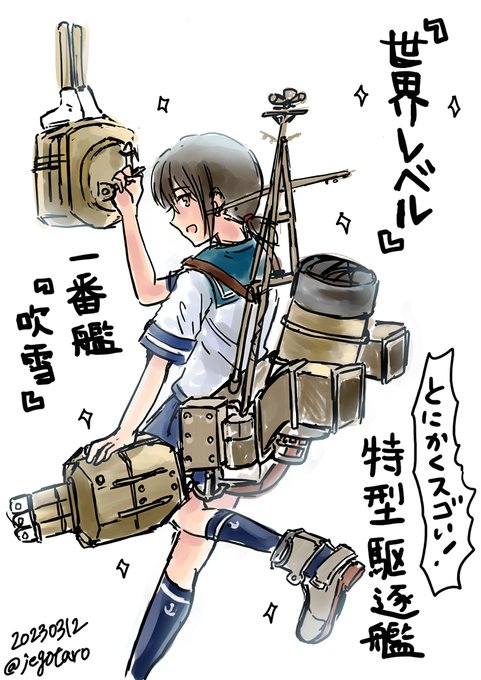 #吹雪版深夜の創作60分一本勝負 @fubuki1draw お題:「世界レベル」 駆逐艦の歴史大型アプデした特型駆逐艦、その一番艦! 偽装を立体見ながら描いたけど一時間の限界…。MSと同じく時々描きたくなる艤装(数年に一度くらいの頻度)魚雷の角度を直したいすぎる~~~