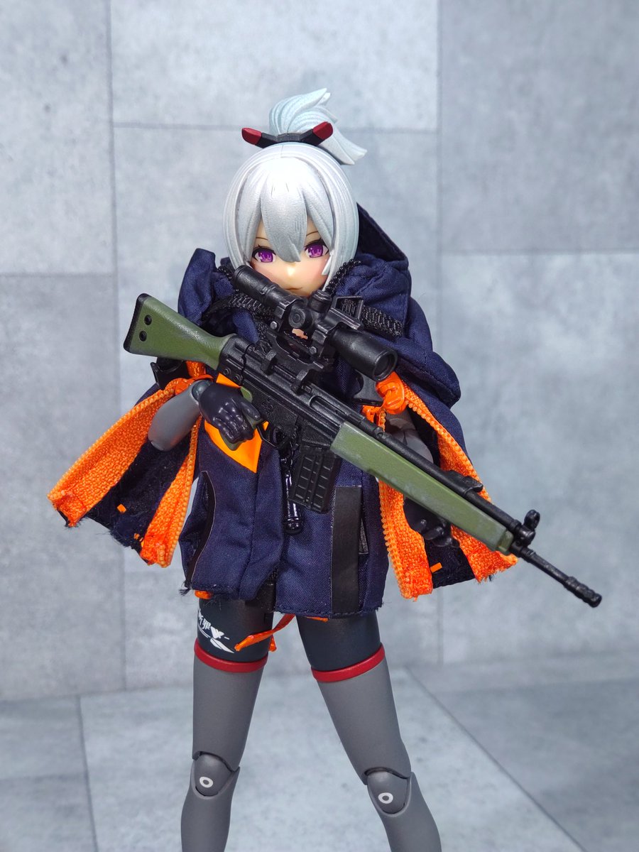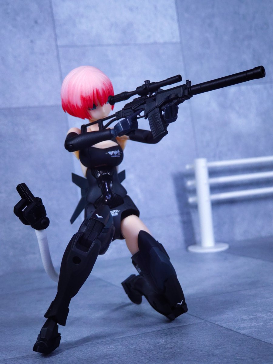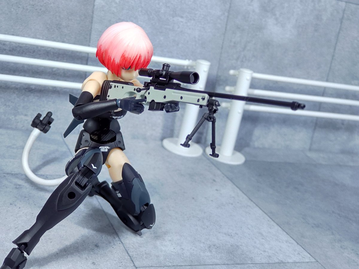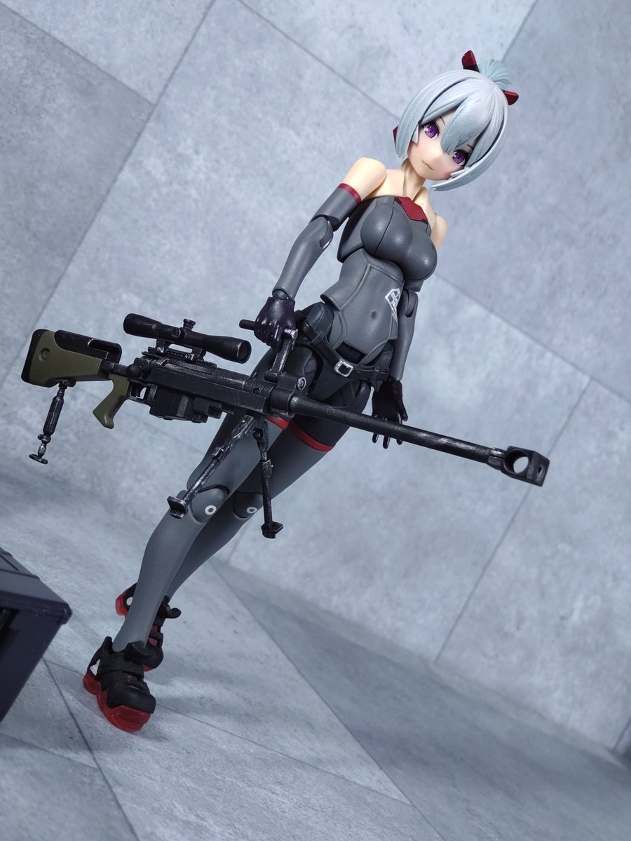 美少女可動素体としては格段に銃を自然に構えやすいメガミですが、それでも流石に長物によっては両手で肩当て姿勢は難しいので、肩ボール部分に引き出し機構を仕込んでより可動範囲を拡張してみる試作。効果は上々かな。 #メガミデバイス