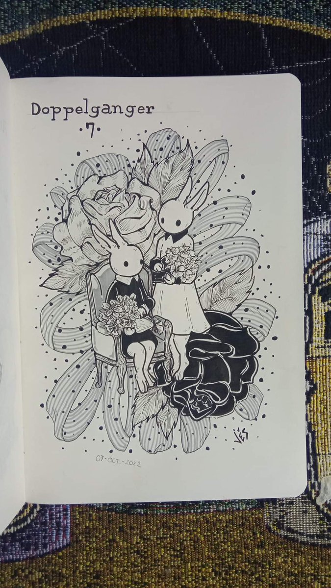 Día 7: Doppelganger Puede entonces, que tengamos algún doble en algún lugar (o en algún otro momento del tiempo), el doble espíritu, aquella otra mitad, siniestra quizás. Igual pero diferente a la vez. #sketchbook #traditionalart #doppelganger #blackandwhiteart #roses #Inktober