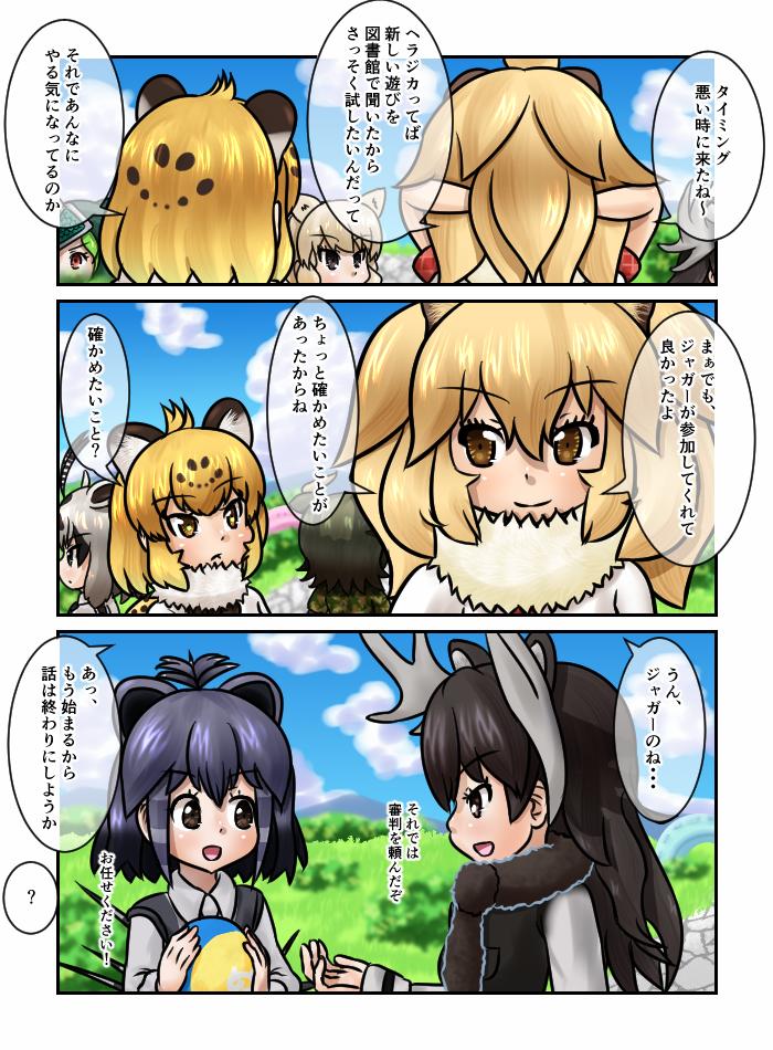 #けものフレンズ お願いジャガーさん 6話(2/?) たまたま1ページ1人ずつヘラジカチームが脱落していく あと何ページで終わるかは描くたびにコマ数が変わるためまだ分からん