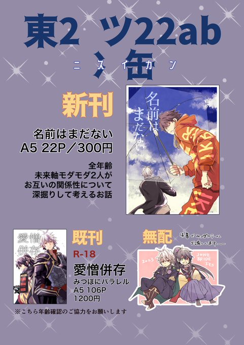 明日(6/25)のお品書きです。 東2ホールツ22ab冫缶(nanaさんと隣接)にて参加予定です。 新刊のほかに手持ちの既刊も持ち込む予定です。あとみつぽにの無配シールみたいなの作ったので良ければそれだけでももらって頂けたらうれしいです…!🙌