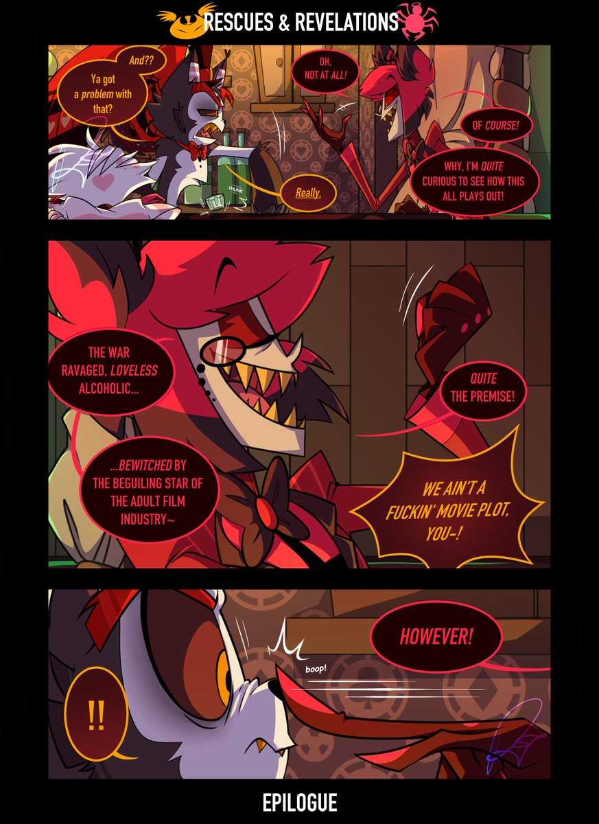Rescues & Revelations (AngelHusk Comic) EPILOGUE // Pg6 + Pg7 END . . . ...yeeeah, i figured i'd better get this thing done before the series comes out & we see any redesigns.😅 added one more page, since it turns out i didn't like leaving it off on pg6. #angelhusk twitter.com/jigokuhana89/s…