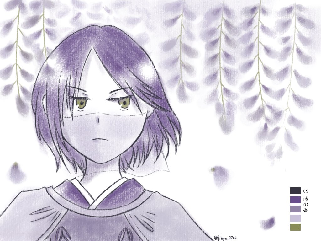 #リプをもらった番号の色を使って絵を描く お待たせして申し訳ないですーっ💦 樟トモエ(@camphorwood0507)さんからリプ頂いた 09 藤の香 で元就様…です、多分……😭 第2衣装なのはお察し下さい(*´’Д’):;*:;カハッ