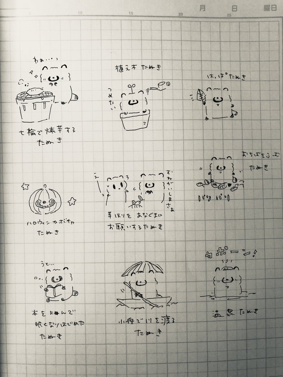 久しぶりにノートの落書き。 描いてから思ったけど七輪で焼き芋はしなさそう🍠 #たぬき