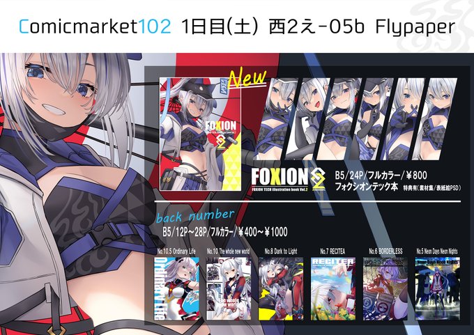 お品書きです。 C102 土曜日西2ホール え-05b「Flypaper」にて、フォクシオンテック本「FOXION 2」を頒布します。詳細はぶら下がってるツイートみて下さい。 お時間がある方は暑さ対策を万全にして是非遊びに来てくださいね、よろしくお願いします! 通販➡pictspace.net/flypaper
