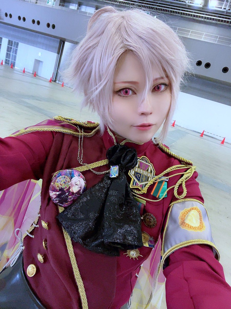 夏コミの写メ❣️今回はちゃんと前髪セットしましたよ(風が吹いてると認識してたので) 天の缶バッチはミワさんがくれた♡♡♡ありがとう🥰
