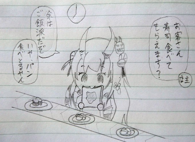 15 57 寿司屋で朝ごはんにパンを食べるお嬢(ご飯派) 今朝のツイートより #百鬼絵巻 21/08/16 13:11