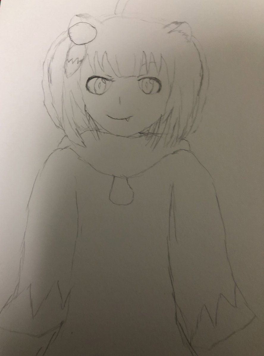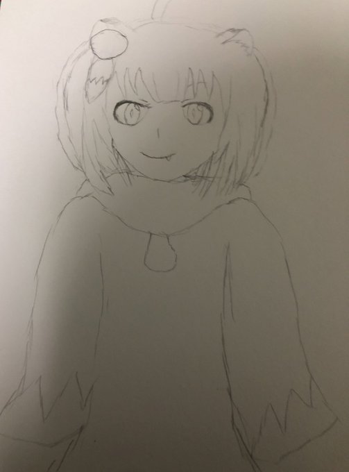 #えまあーと 最近(?)流行りの動画の「たべるんごのこ」風のえまさんぽい人(下書き)です。(元ネタはわかりません) えまさんの場合は吊すんごか逃げるんごですかね?