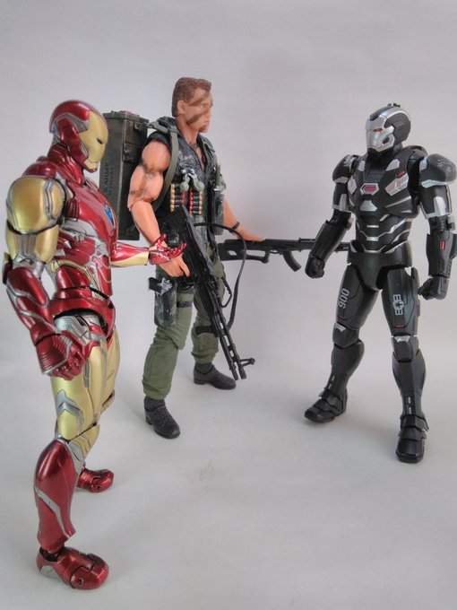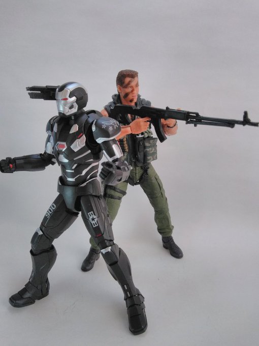 「ローディ、新型のウォーマシンアーマーだ」 「マジ?」 「これを着れば敵の弾が当たらなくなり弾切れも心配なくなるぞ」 「そんな気がしてきたな…」 「ウォーマシンはアメリカで生まれました。日本の発明品じゃありません」 #オモ写 #フィギュアーツ写真部 #アベンジャーズ #コマンドー