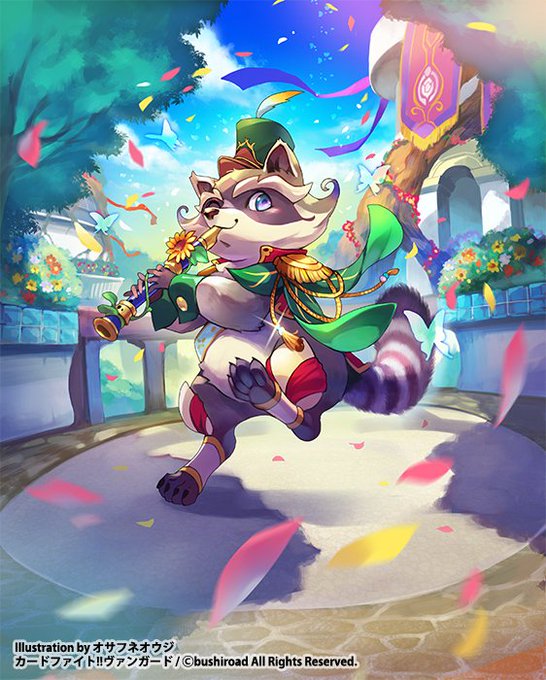 【本日発売】カードファイト!!ヴァンガード ブースターパック第6弾「鳳竜焔舞」にて『リコーダー・ラクーン』描かせていただきました!ストイケイアの色彩豊かなワンシーンが伝われば幸いです🌟🦝🦋 cf-vanguard.com/tcg/ #ヴァンガード #cf_vanguard