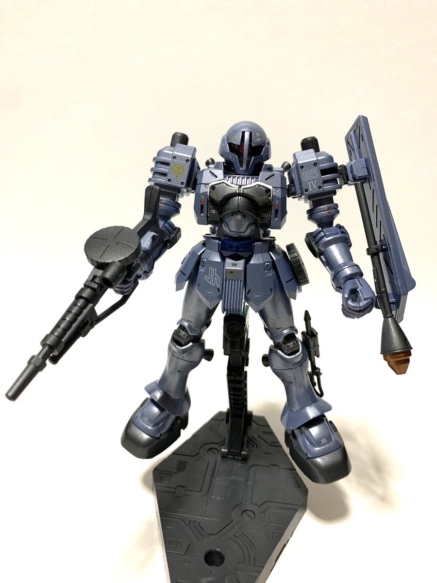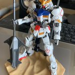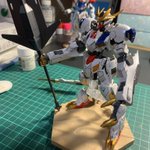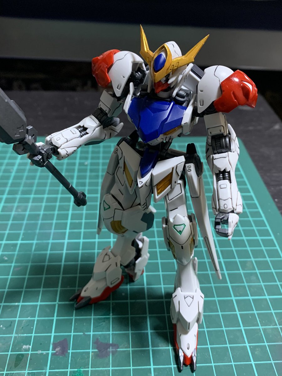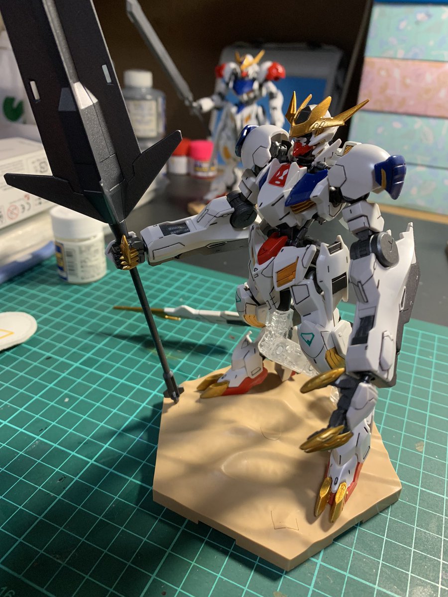朝プラモ。 引っ越し準備で箱詰めしていたら、どうしても1つ入らないので、グリムゲルデをランナーごとフラットクリア、ライトガンメタル、ゴールドを吹いて半日で組み上げの、お手軽仕様。…な割には上手くいったかもしれない(笑) #鉄血のオルフェンズ #ガンプラ #グリムゲルデ