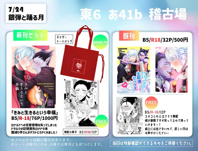 7/24お品書き 東6 あ41b 「稽古場」 ロドの新刊にノベルティのギャザートートと30年後無配ついた新刊セットと既刊があります~! スパコミのΔ無配も少し残ってるので持っていきますお願いします~! #銀弾と踊る月2022