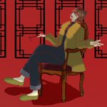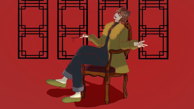 #ツイステファンアート シャンティ/ KAITO MMDをトレースしました。絶対ラギーくんは似合うと思った。 モデル:tomoyo式ラギー・ブッチ アンティークチェア:とりそば様 キセル:ねこる(宝飾p)様 チャイナ風格子窓ステージ:kumakuma様 衣装参考:シャンティ(wotaku)様