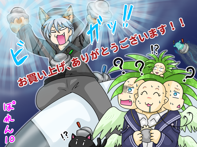 三つ首達がバザーで売ってた例のブツを買って頂いたので・・・・隅っことは言え購入者(?)の人達を描かせて頂きましたで・・・・それにしても何に使うのでしょうねー? #ぽれん #ぽれん応援絵 #ぽれん動画内で紹介して