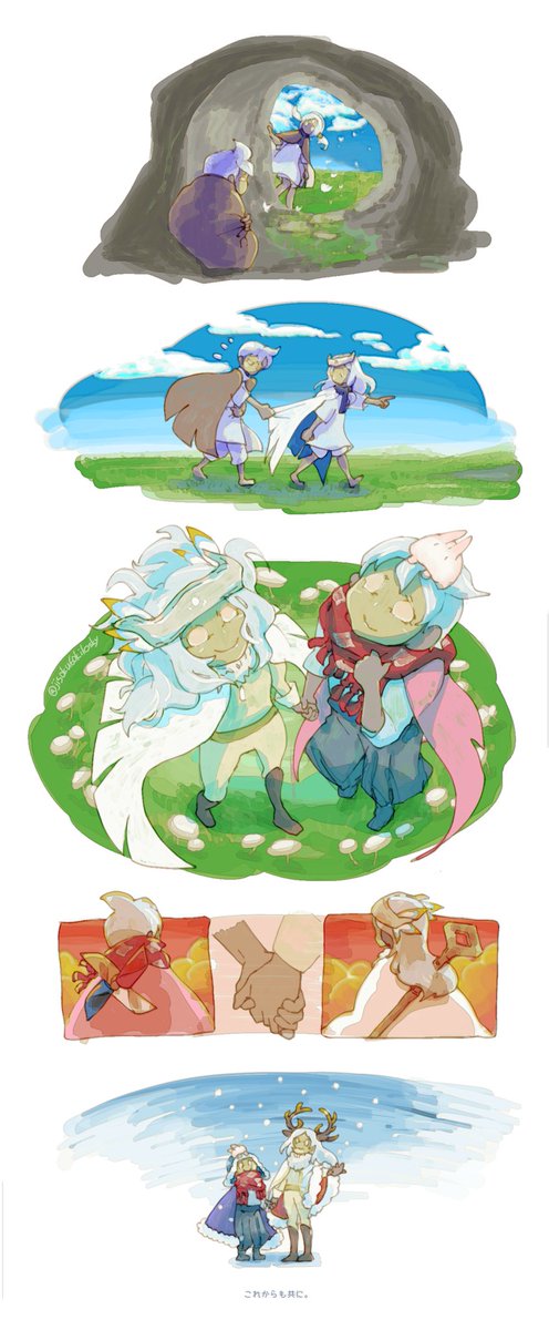 シロちゃんにお世話になった件がありお礼にイラストを描きました。 ここ半年近くのスクショからシロちゃんフォルダを作り初期ニカノノからクリスマスまで描かせていただきました。 なんと一枚も空飛んでるの無いんですwお散歩絵ばかりですが楽しかった! #sky星を紡ぐ子どもたち #thatskygame twitter.com/shiror0r0/stat…