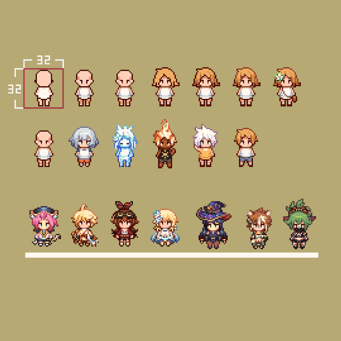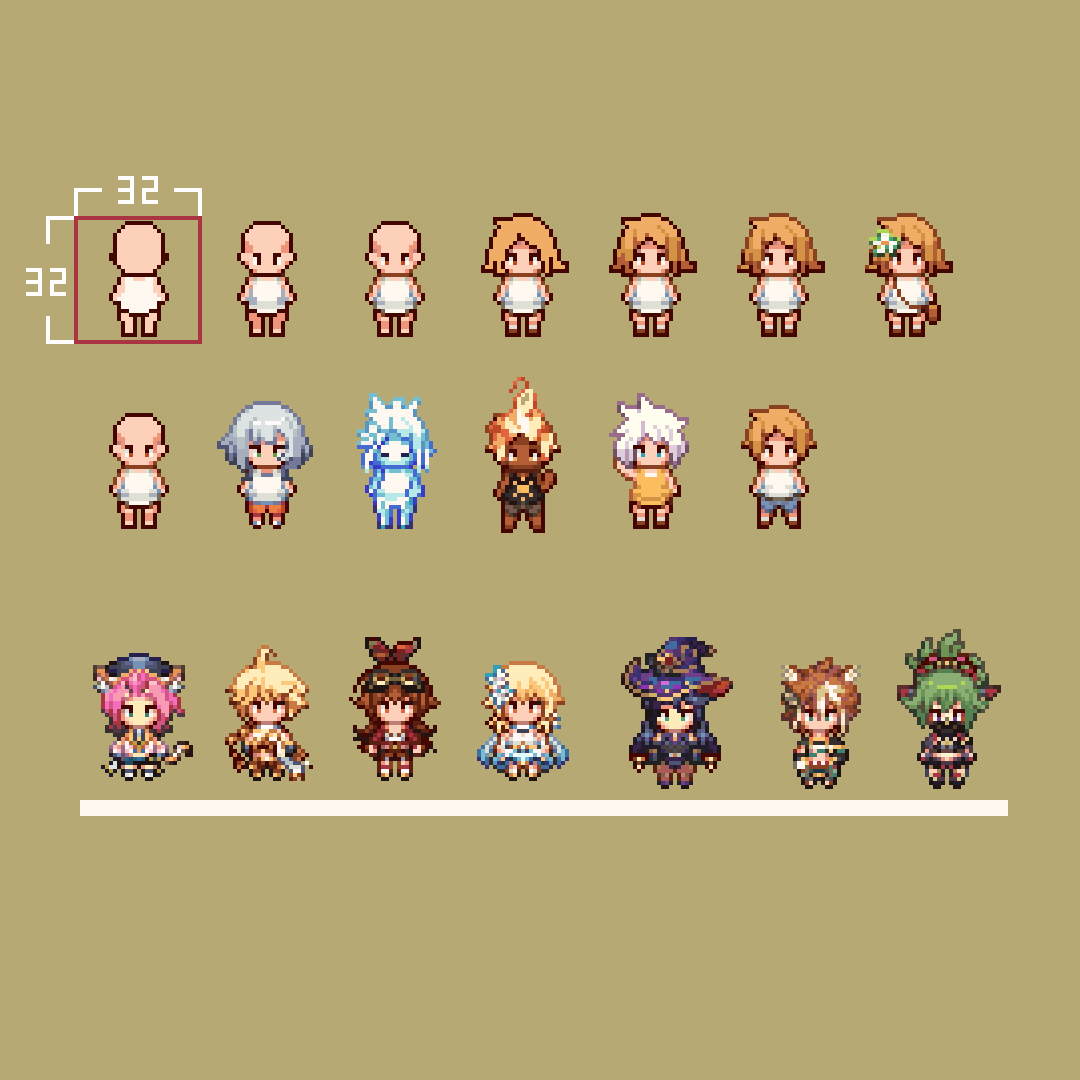 65 394 大体32x32のキャラクターのわりといい加減なメイキング。 完成品の下段の白いラインのキャラクターは原神のキャラです。 #ドット絵 #pixelart #原神 #genshinimpact 22/07/27 20:12