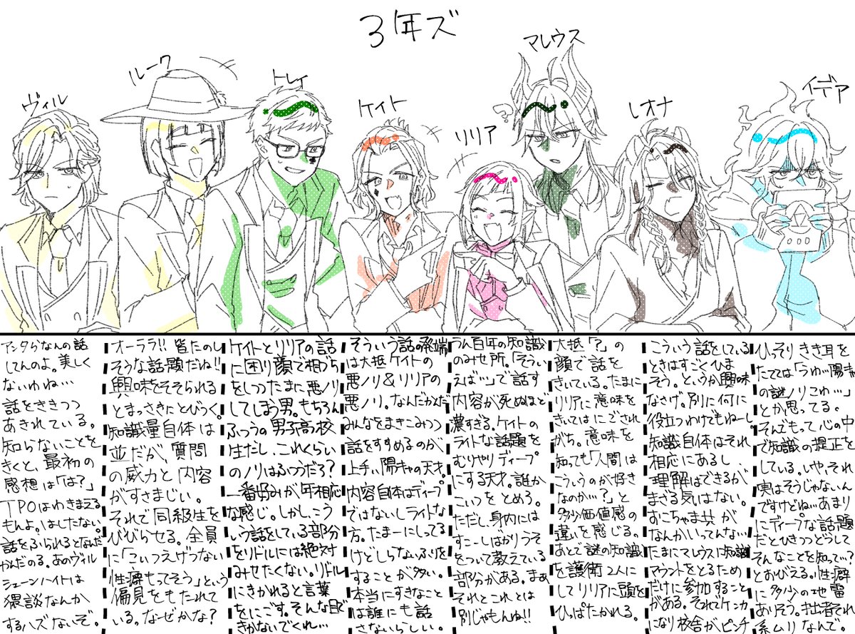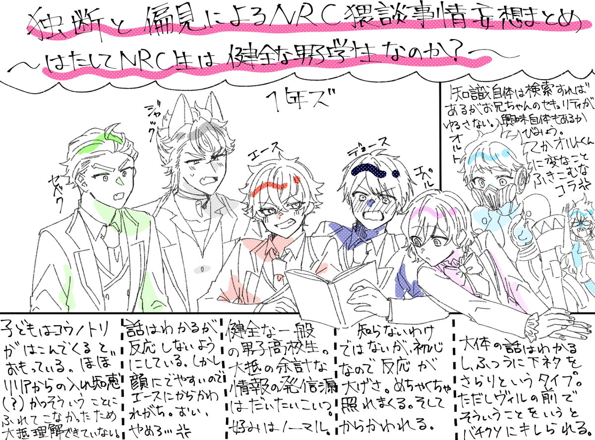 独断と偏見によるNRC生猥談事情妄想まとめ。学年ごと。 とっても捏造とか妄想の塊なので注意。 男子学生だし、少しはそういう話をするよねーの気持ちで考えました。字が汚くて申し訳ないです。 #ツイステファンアート
