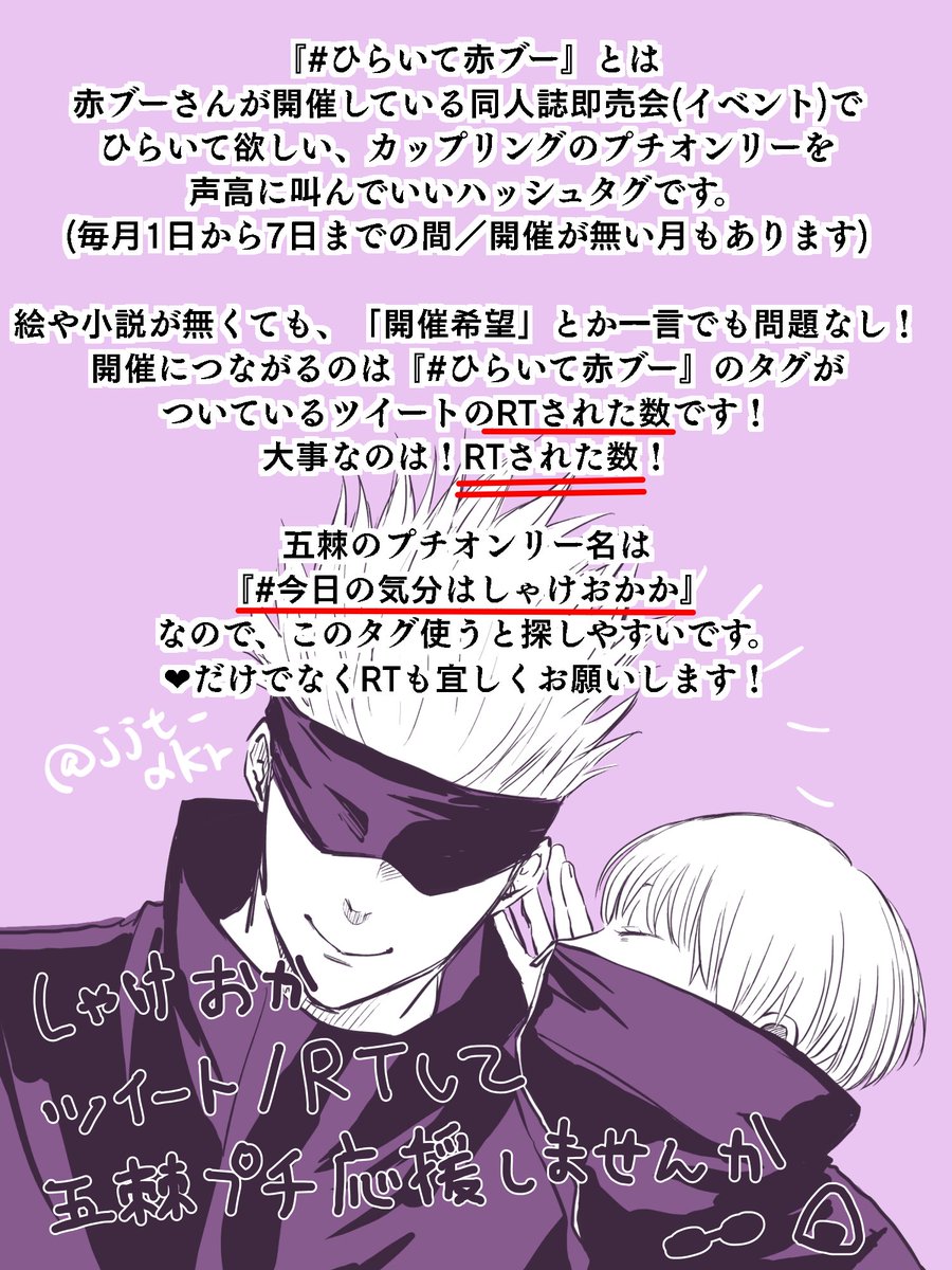 #ひらいて赤ブー #今日の気分はしゃけおかか 呪🤞廻📢 五🕶悟×狗🍙棘 プチオンリー開催継続宜しくお願いします❗️ 3/7までのRT数がごとげプチ開催に繋がります、RTご協力いただけると嬉しいです (ついったの状況に応じて大丈夫そうであれば是非) プチがあると!本が増えるぞ!(多分)