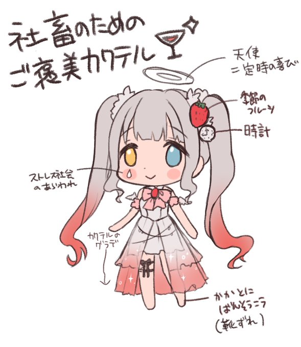 0 13 滑り込み・・・🥺💦💦💦 日頃頑張ってる社畜さんへのご褒美になるような カクテルをイメージして描きました・・☺️ 社畜さん要素を残しつつ 甘くて優しいカクテルさんです🍸 21/02/21 00:30