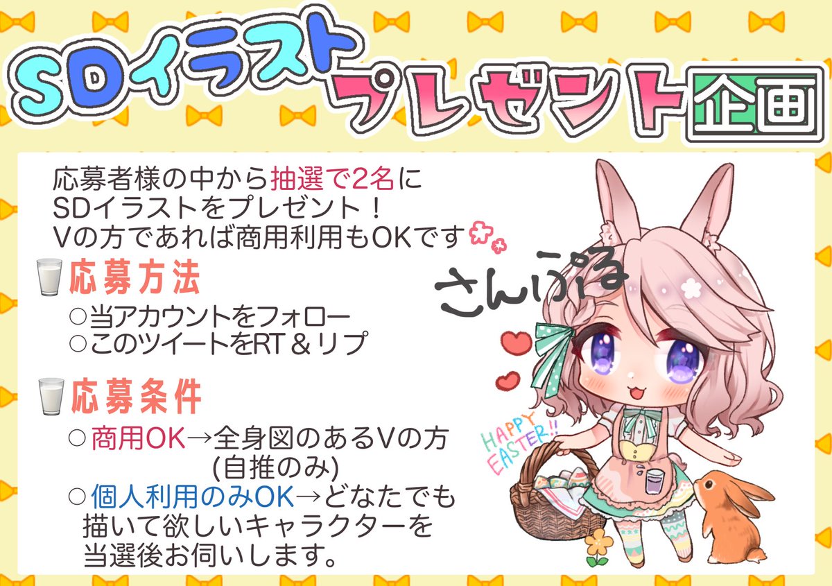 114 119 🎁SDイラストプレゼント企画 フォロワーさん1111人突破企画です✨ お気軽にご参加頂けると嬉しいです🥰 Vさんの自推なら商用利用OK!🙆🏼♀️ (全面図があれば準備中でもOK) ⚠️締切:4/30いっぱいまで 21/04/21 21:37