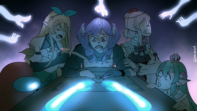 Did a fanart of the girls freaking out over a ghost playing with the ouija board Can't wait for the Phasmophobia collab stream! #Propsuki #Artsuki #PomuPaint #GalleryOfRoses #Ryugraphics #Finanart #NIJISANJI_EN #vtuber