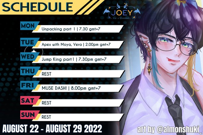 SCHEDULE!! I forgor to post Tags general : #Joyoey FA : #Joey_art meme : #Anjoeyy Live/Clip : #Joeyraivu YT : youtube.com/c/JoeyRurvoir Tiktok :tiktok.com/@joeyrurvoir