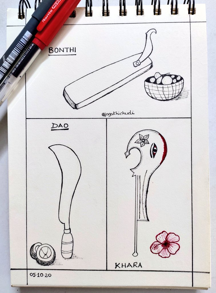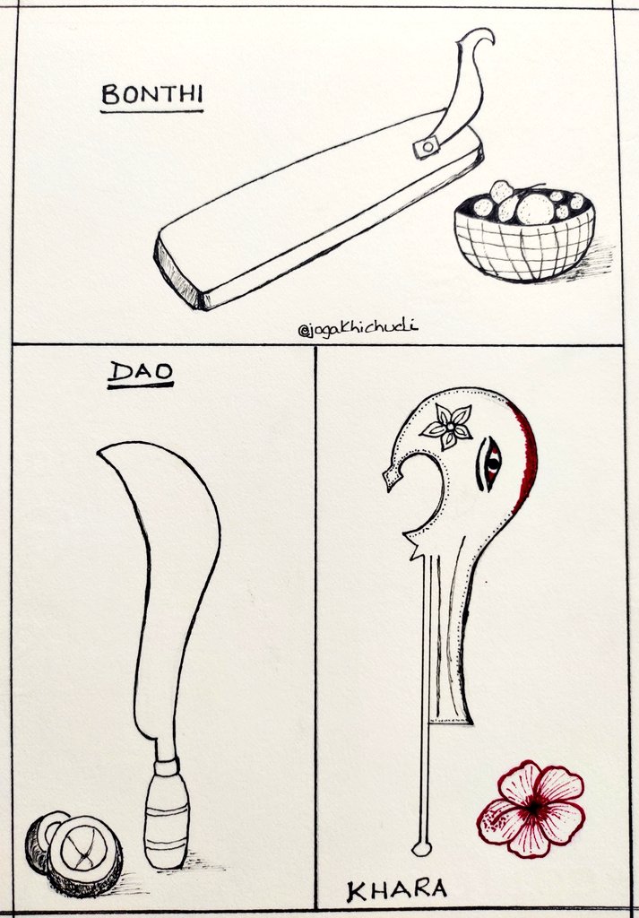 Day 5 #inktober2020 : #blade These are the 3 blades that I've grown up seeing used as a Bengali kid n now is part of my household too! - Mom's "bonthi" for kitchen - Dad's "haath dao" for coconuts etc - Maa Kali's "khara" in thakurghor #inktober2020day5 #inktober #jogadoodles