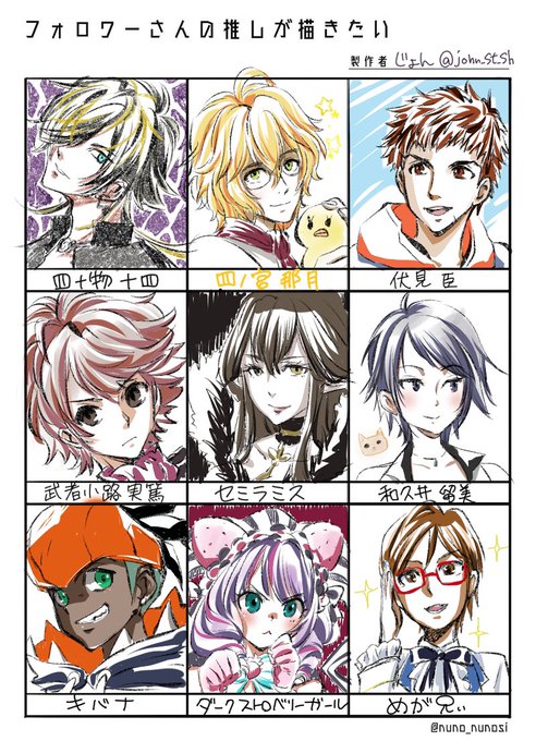 2シート目もできました〜! 構ってくれてありがとうございました! 別のことやりたいので、ここで終わりにします またやりたくなったら遊んでくださーい!! 最後のめが兄ぃさん、検索したらとても混乱しましたwww #フォロワーさんの推しが描きたい