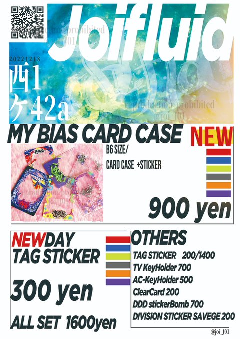 お品書き作ったっ!!簡易ッ!!12/18は西1のケ42aでお待ちしてます!!新作カードケースとステッカーの他にもあくきーやステッカーセットをもっていきます💐💐💐過去作持ち込みは色々書いてあるけどそれぞれ確約ではないので(机にのるかわかんない)ご容赦ッ🕺🕺🕺🕺※全部会場頒布価格です! twitter.com/joi_J01/status…