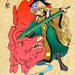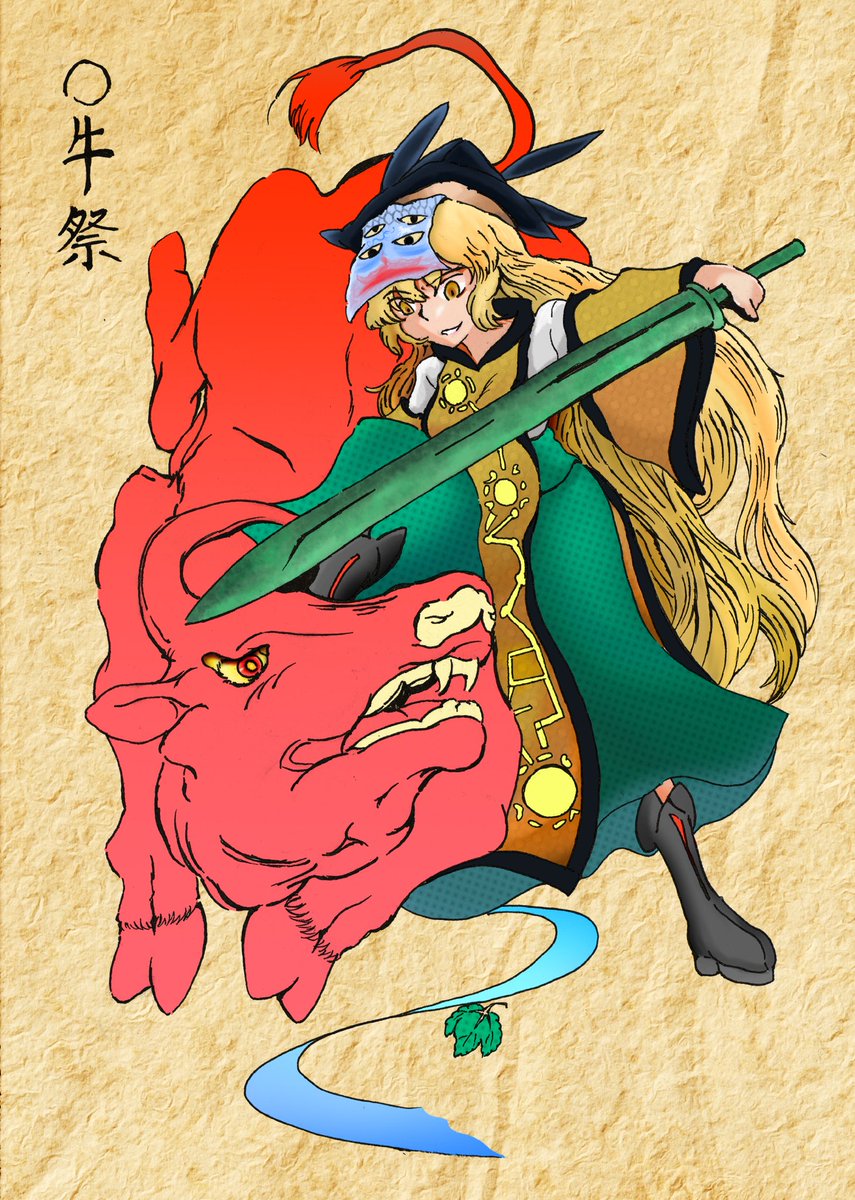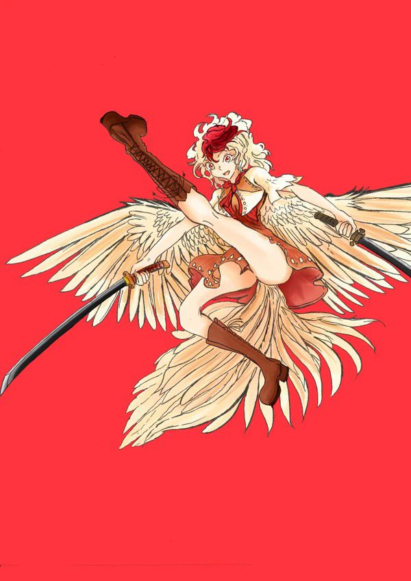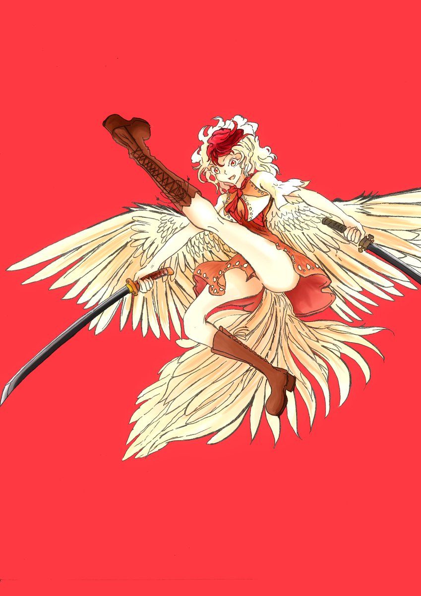 庭渡久侘歌です。脚! 闘鶏をイメージして、鋭い攻撃力をイメージして刀剣を持たせました。 闘鶏は年中行事としての神聖なイメージもあるので、くたかちゃんにぴったりと思いますぜ