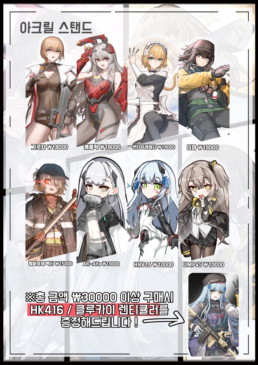 8월 킨텍스 서코에서 제작할 아크릴스탠드용 이미지들의 리스트입니다;; 토로로, HK416, 클루카이, 교수, 댄들라이M4, 오가타 칸나 기회가 되는대로 다른 아이템도 제작할 예정;;;;
