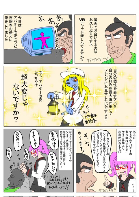#VRCジョジョ立ち集会 ご依頼があり、ご案内などこっそりお手伝いをしてました 名前負けしてなければ! #VRCスチパン集会 スチパンにはちょっと一家言あり、最高なイベントでした! #今日も一日生き延びてえらい ここで以前描いた漫画をカラーに再掲。僕の名前の由来です #VRC漫画 #ケミカルアバター