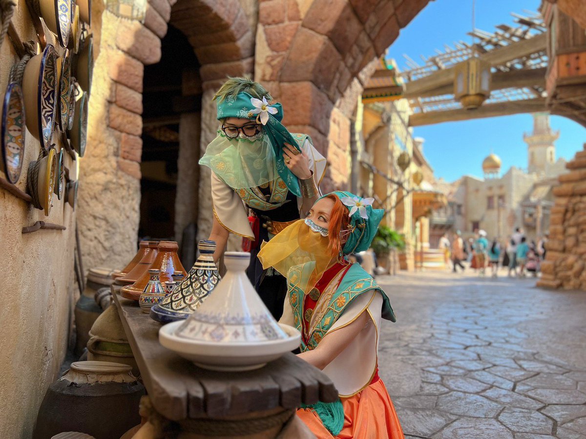 【 ツイステ 】 アラビの魔法の絨毯体験できた~❣️ ヤーサミーナシルクで撮りたいな~って思ってたから空いてて嬉しかった🙏💕 トレイ♣️ @yomogi_ado ケイト♦️ @joker_wonder #Dハロ仮装2022 #Dハロ仮装