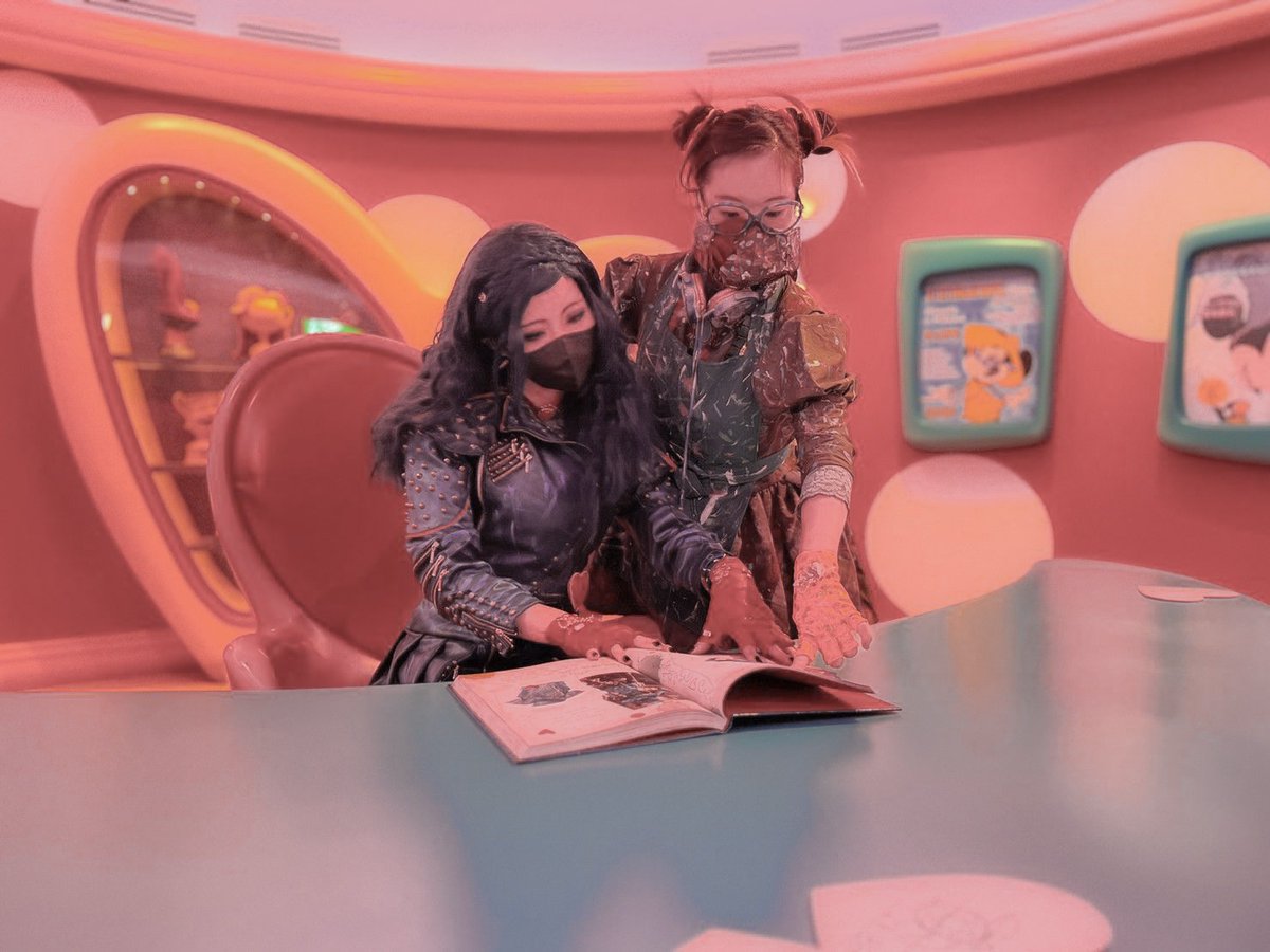ディジーとミニスタでいっぱい写真撮ってきた💕 あの美容室シーンみたいの撮れて嬉しい😳💕💕ディセンダントはいいぞ😌✨ ディジー🌼 @one5005 イヴィ🍎 @joker_wonder 📸1&本 @Dlove_coronn 📸2.3 @yomogi_ado #Dハロ仮装2022 #dハロ仮装