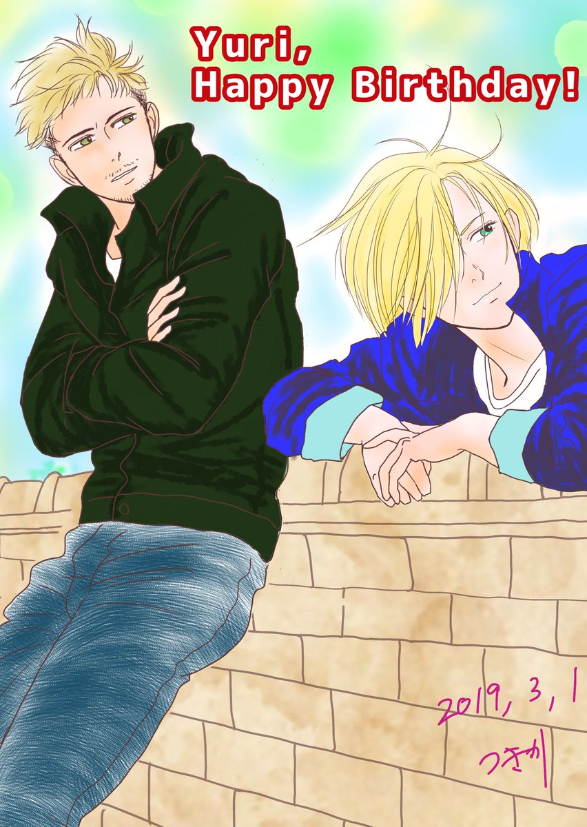 39 164 #ユーリ・プリセツキー誕生祭2019 ゆらちか、おめでとう〜🎉🎊🍾🎊🎉 金髪、緑の瞳コンビで描いてみた。なんか珍しい組み合わせw (ポーズはイケメン外国人から) 19/03/01 17:07