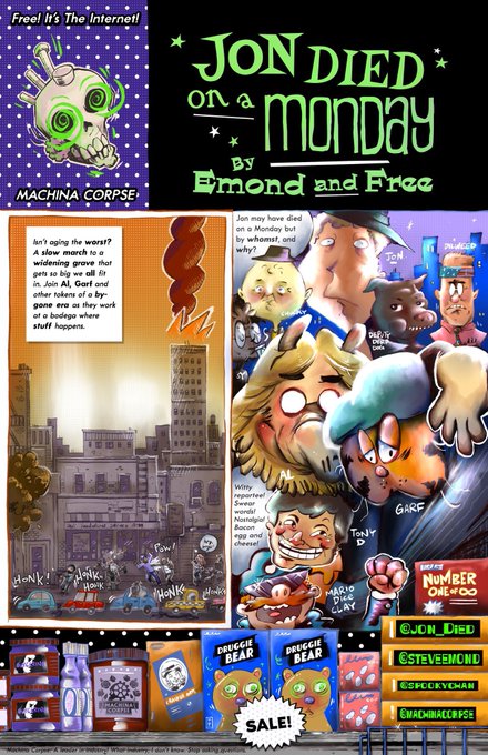 Happy #webcomicday! Please check out our comic “Jon Died On A Monday.” Garf mourns the loss of his owner Jon while working at a bodega with his bestie Al and a menagerie of familiar nostalgic characters, all grown up. Inspired by the 80’s, 90’s & 00’s. Not #alf Not #garfield 🧵👇🏻