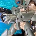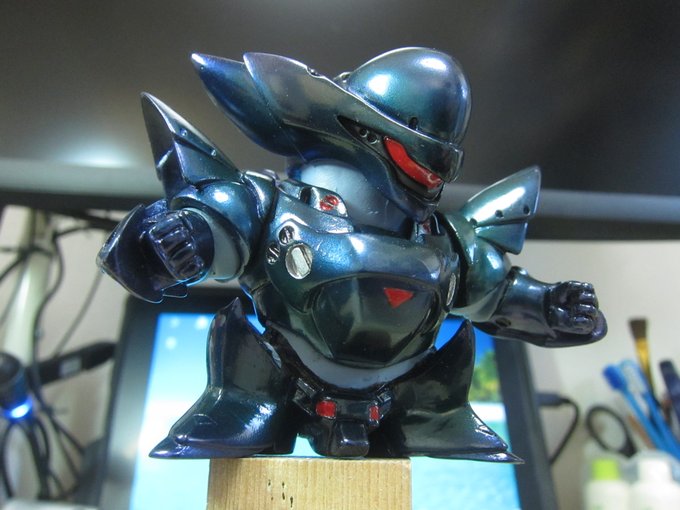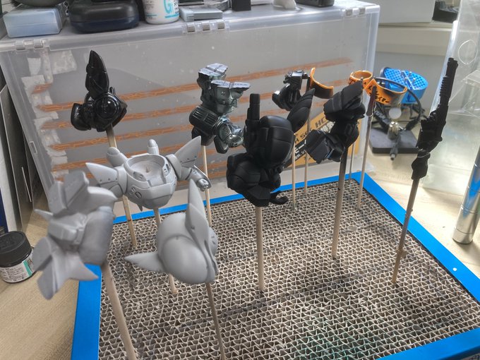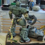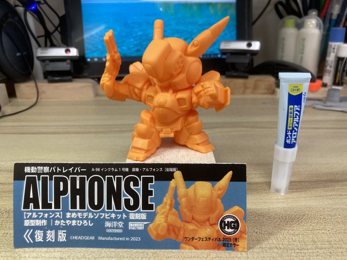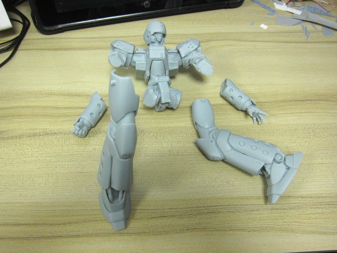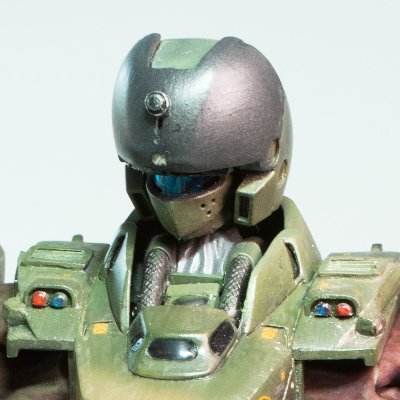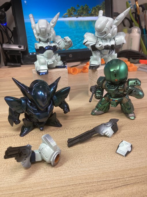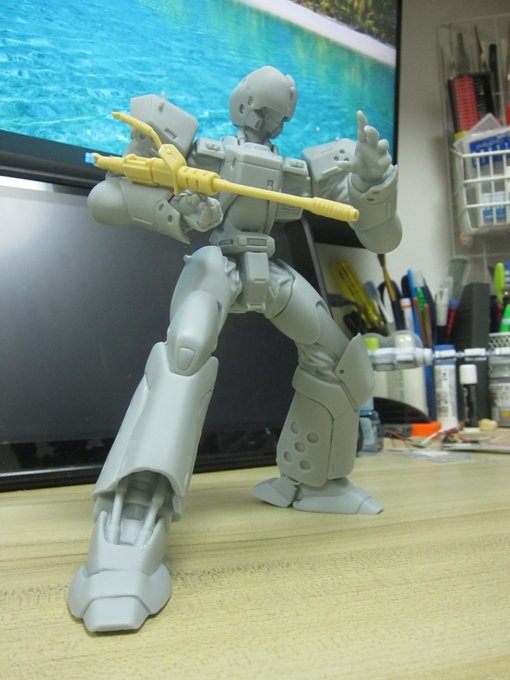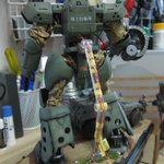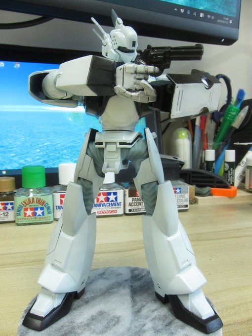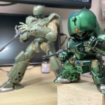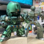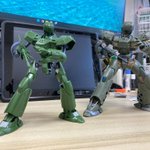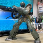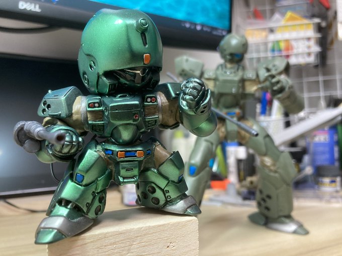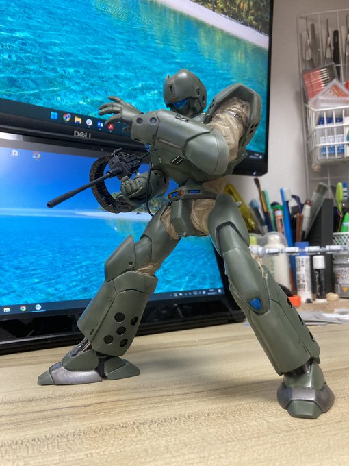 WFで手に入れた、ヘルダイバーの1/35ソフビキットの塗装がとりあえず完成です. 透明感を出したいところは、センサ部は長谷川のフィニッシュシート、頭部バイザーはクリアの厚塗りでやってみました. #パトレイバー模型部