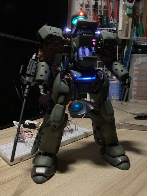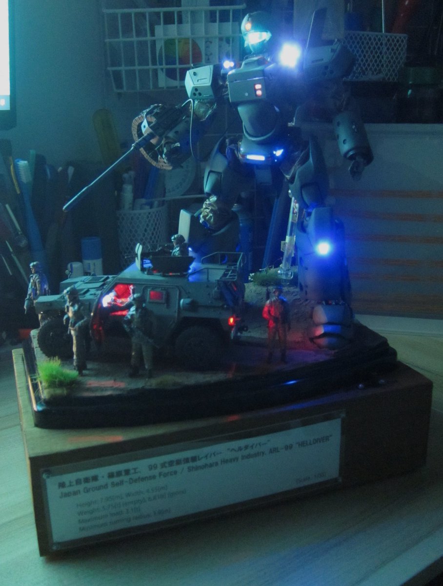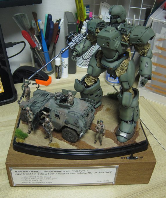 諸々の工作を経て,ヘルダイバーのビネットが完成できたので,幕張国際レイバーショウにエントリーしました.どうかご受理頂けますように…(-人-) 電飾がスイッチでON/OFFできるようになったので,無闇にカチカチやって喜んでます. #幕張レイバーショウ #幕張国際レイバーショウ #パトレイバー模型部